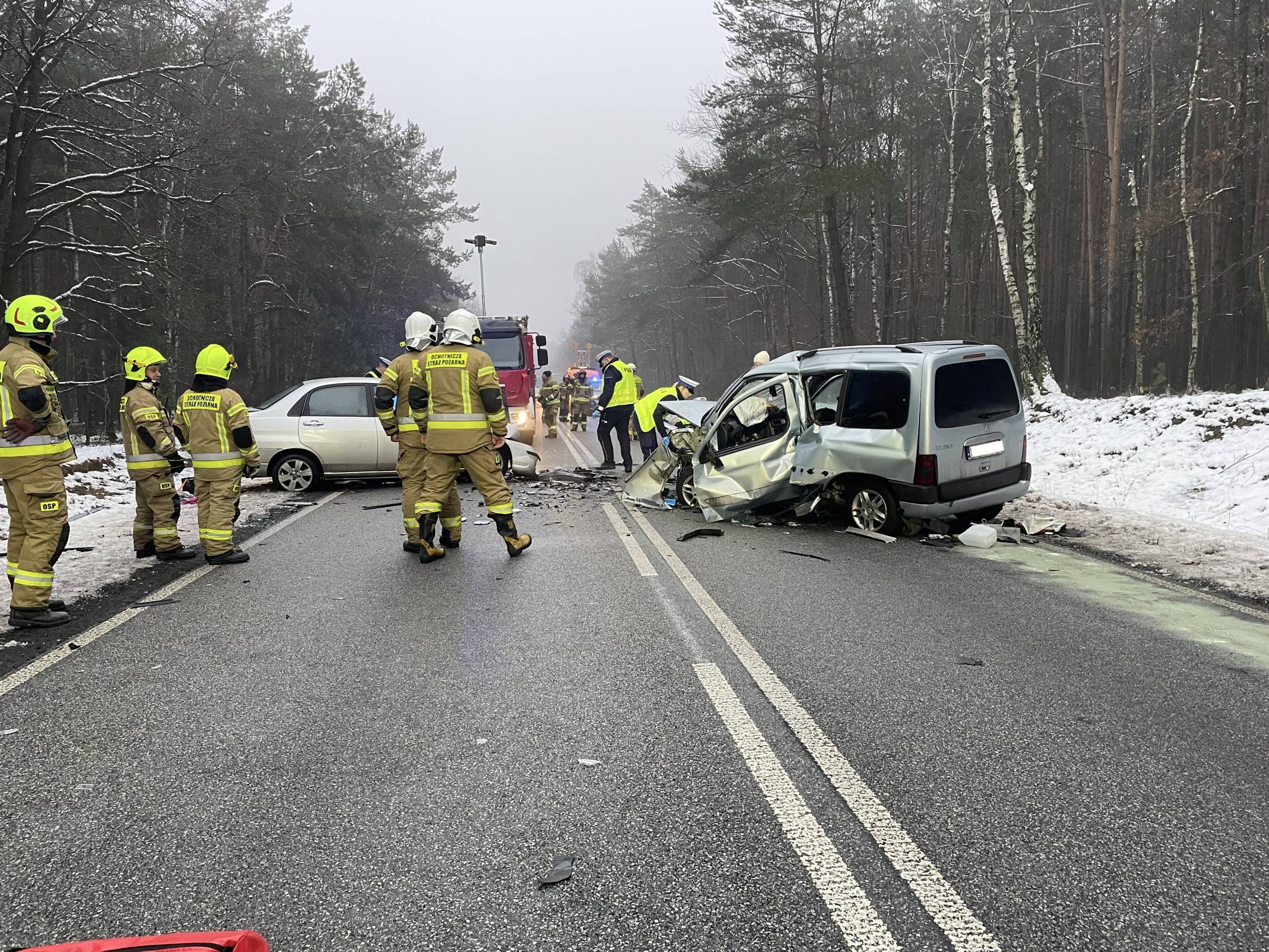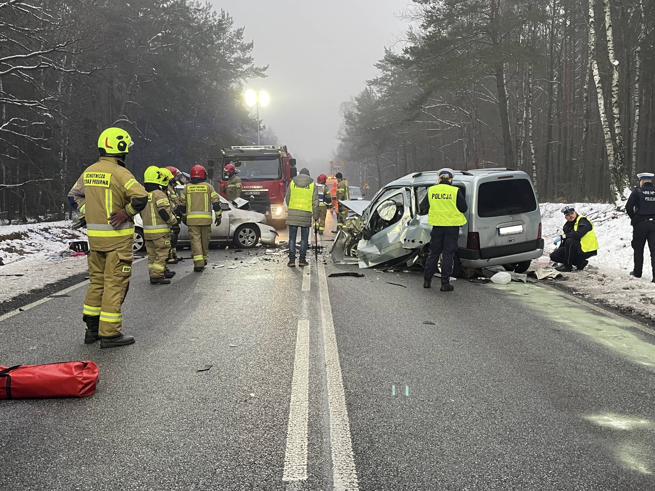 Na miejscu pracują policjanci, strażacy oraz prokurator, którzy ustalają dokładne okoliczności zdarzenia. Droga krajowa pozostaje całkowicie zablokowana, a utrudnienia mogą potrwać jeszcze około dwóch godzin.